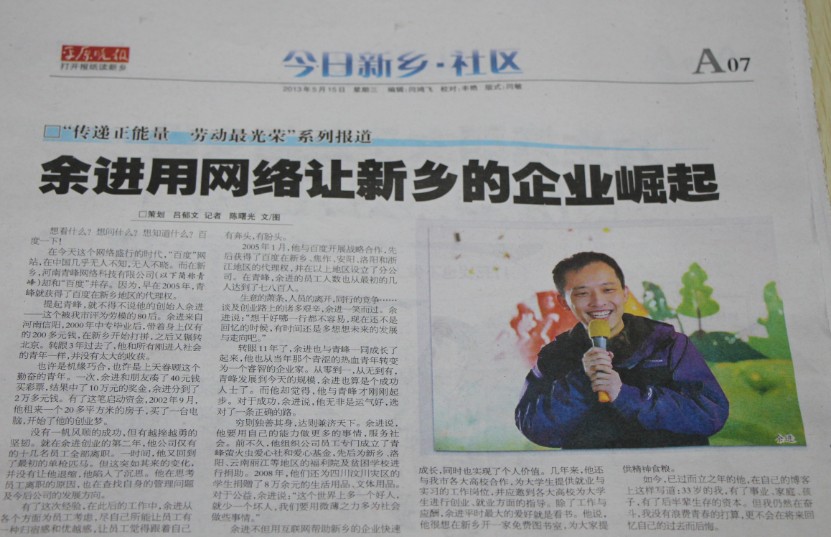五月十五日,新鄉(xiāng)《平原晚報(bào)》,發(fā)表了新鄉(xiāng)市“五一”勞動(dòng)獎(jiǎng)?wù)芦@得者:河南青峰網(wǎng)絡(luò)科技有限公司總經(jīng)理余進(jìn)的專訪文章:余進(jìn)用網(wǎng)絡(luò)讓新鄉(xiāng)企業(yè)崛起。