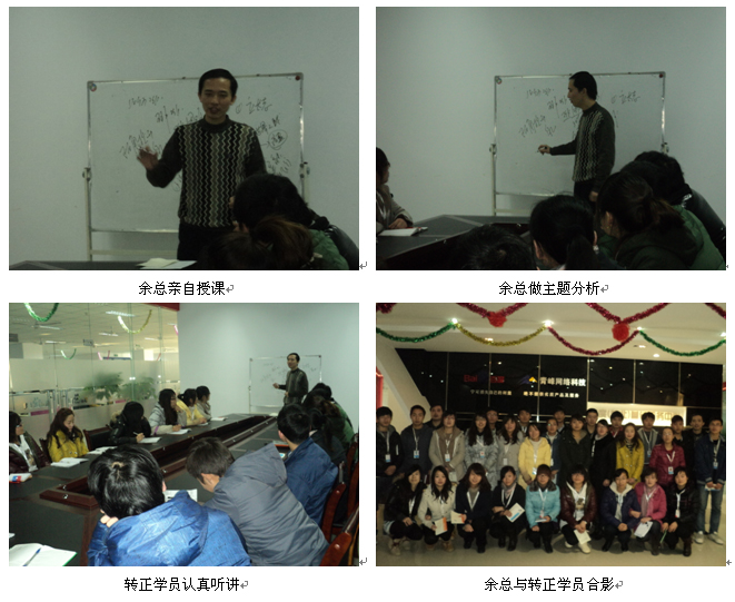 2011年12月17日上午10點(diǎn),新鄉(xiāng)青峰網(wǎng)絡(luò)第三期轉(zhuǎn)正培訓(xùn)如期舉行,青峰網(wǎng)絡(luò)總經(jīng)理余進(jìn)先生親自為轉(zhuǎn)正的新人做培訓(xùn),所有參訓(xùn)人員備受鼓舞。