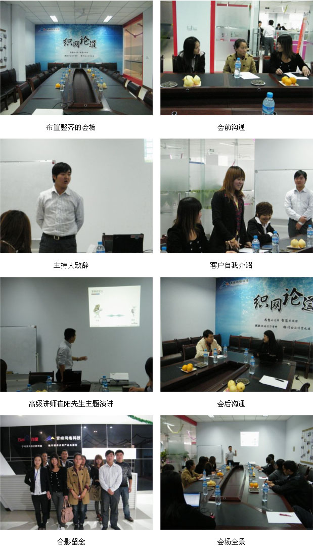 2011年10月20日,在這陽光明媚的下午,青峰網(wǎng)絡(luò)會(huì)議室舉辦了第十一期織網(wǎng)論道活動(dòng),本次活動(dòng)由青峰網(wǎng)絡(luò)高級(jí)講師崔陽先生主講,旨在幫助新加入百度的客戶更深一步的了解網(wǎng)絡(luò)營銷,讓客戶的每一分錢都花在刀刃上。