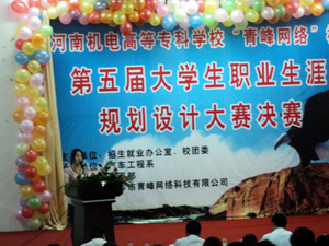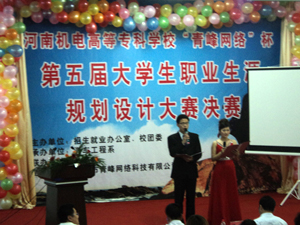 為了引導學生樹立正確的職業(yè)觀念和職業(yè)理想,學會根據社會需要和自身特點進行職業(yè)生涯規(guī)劃,并以此規(guī)范和調整自己的行為,為順利就業(yè)、創(chuàng)業(yè)創(chuàng)造條件。 新鄉(xiāng)青峰網絡科技有限公司與河南機電高等??坪献?,2011年5月19日,河南機電高等??茖W?!扒喾寰W絡”杯第五屆大學生職業(yè)生涯規(guī)劃大賽決賽在河南機電高等專科學校大學生藝術活動中心隆重舉行,河南機電高等??茖W校校團委書記,汽車工程系主任,招生就業(yè)辦公室主任等校領導親臨現場,大賽邀請青峰網絡科技有限公司總經理余進先生,中國CHO俱樂部秘書長,香港美好國際戰(zhàn)略顧問鄭華童先生,全球職業(yè)規(guī)劃師,國家高級職業(yè)指導師樊永兵先生,全球職業(yè)規(guī)劃師,河南師范大學教授馮峰先生作為大賽決賽評委。